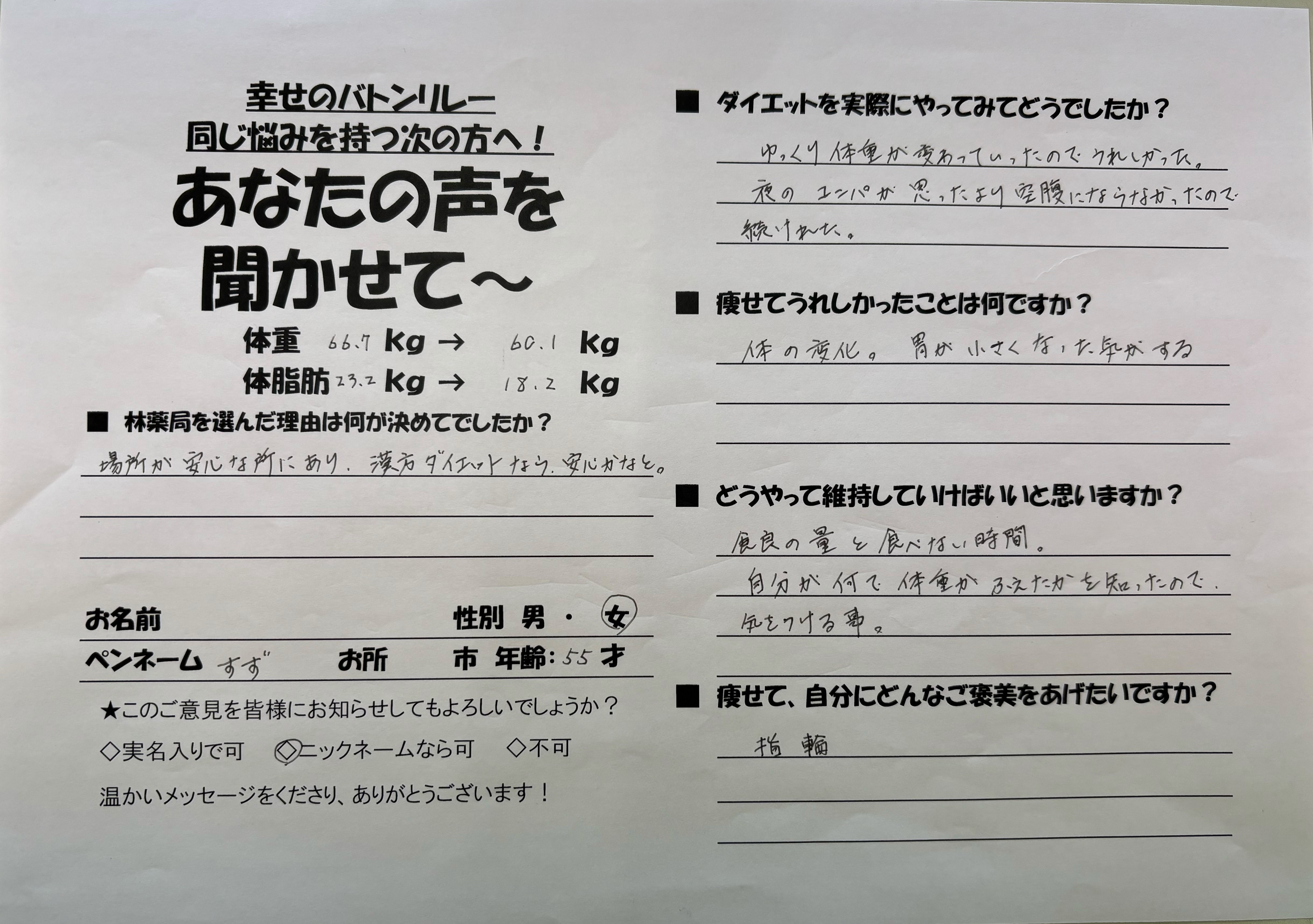 55歳女性 マイナス6.6kg達成おめでとうございます。